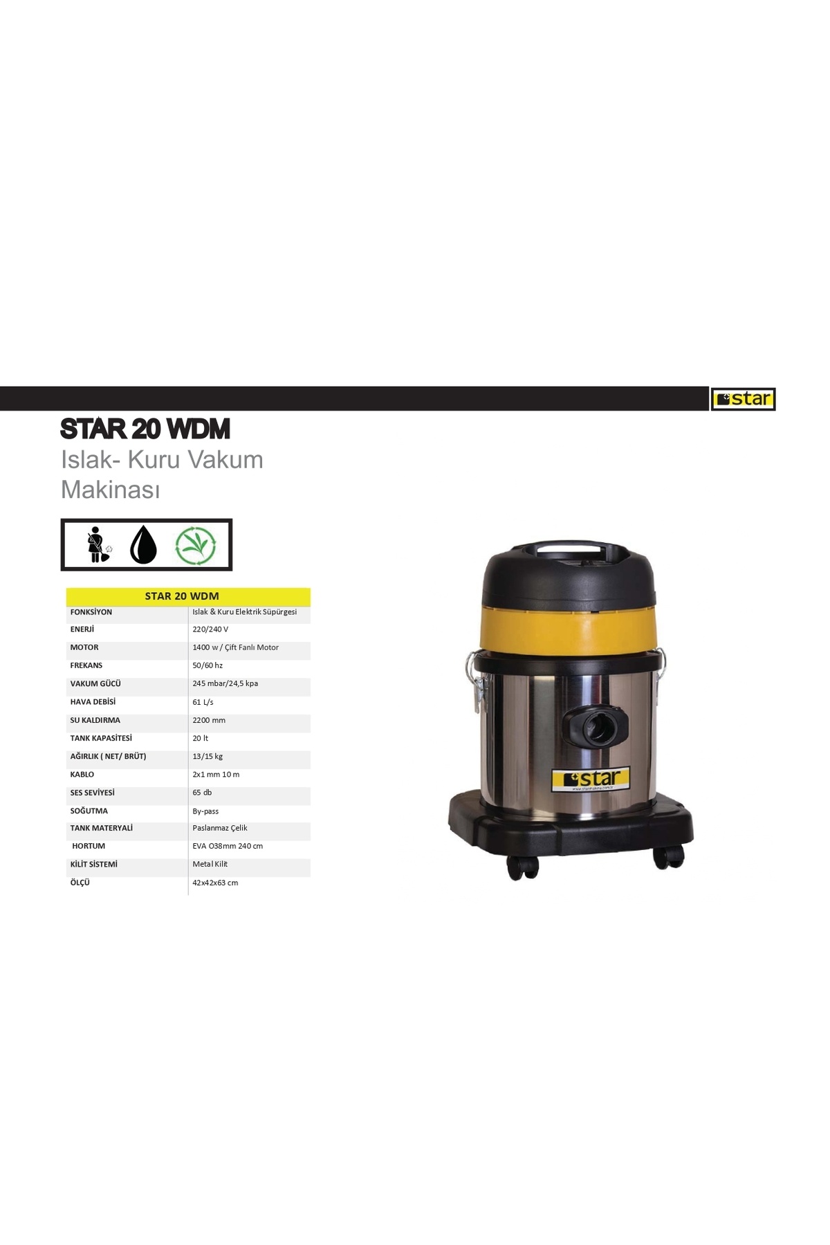STAR MAKİNA Islak Kuru Profesyonel Elektrik Süpürgesi Plastik Star 20 WDM